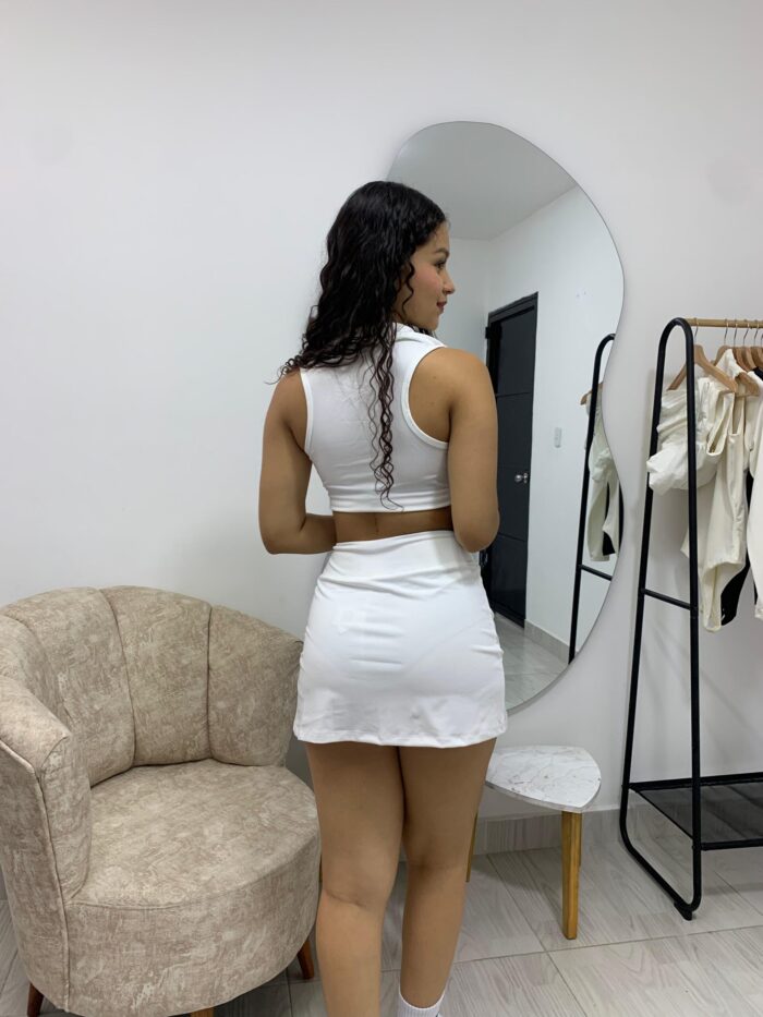 Falda mini con licra debajo, cuenta con abertura lateral que estiliza las piernas y brinda libertad de movimiento.