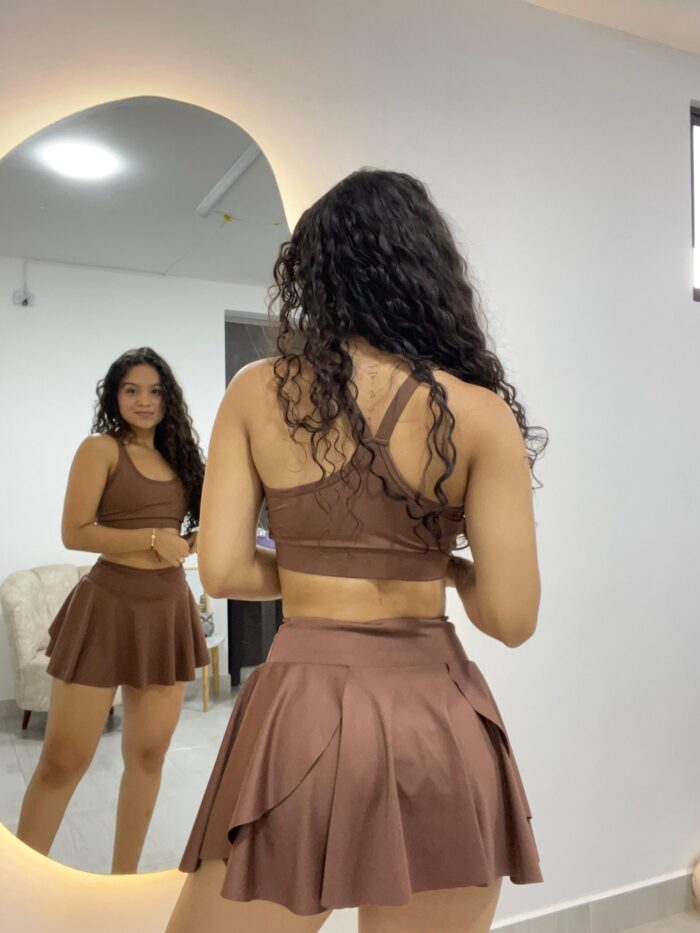 Este set deportivo en tono chocolate te hará sentir poderosa y cómoda. Compuesto por un top de soporte medio y una falda con short interno, es ideal para entrenar, bailar o simplemente destacar con un look distinto y sofisticado.